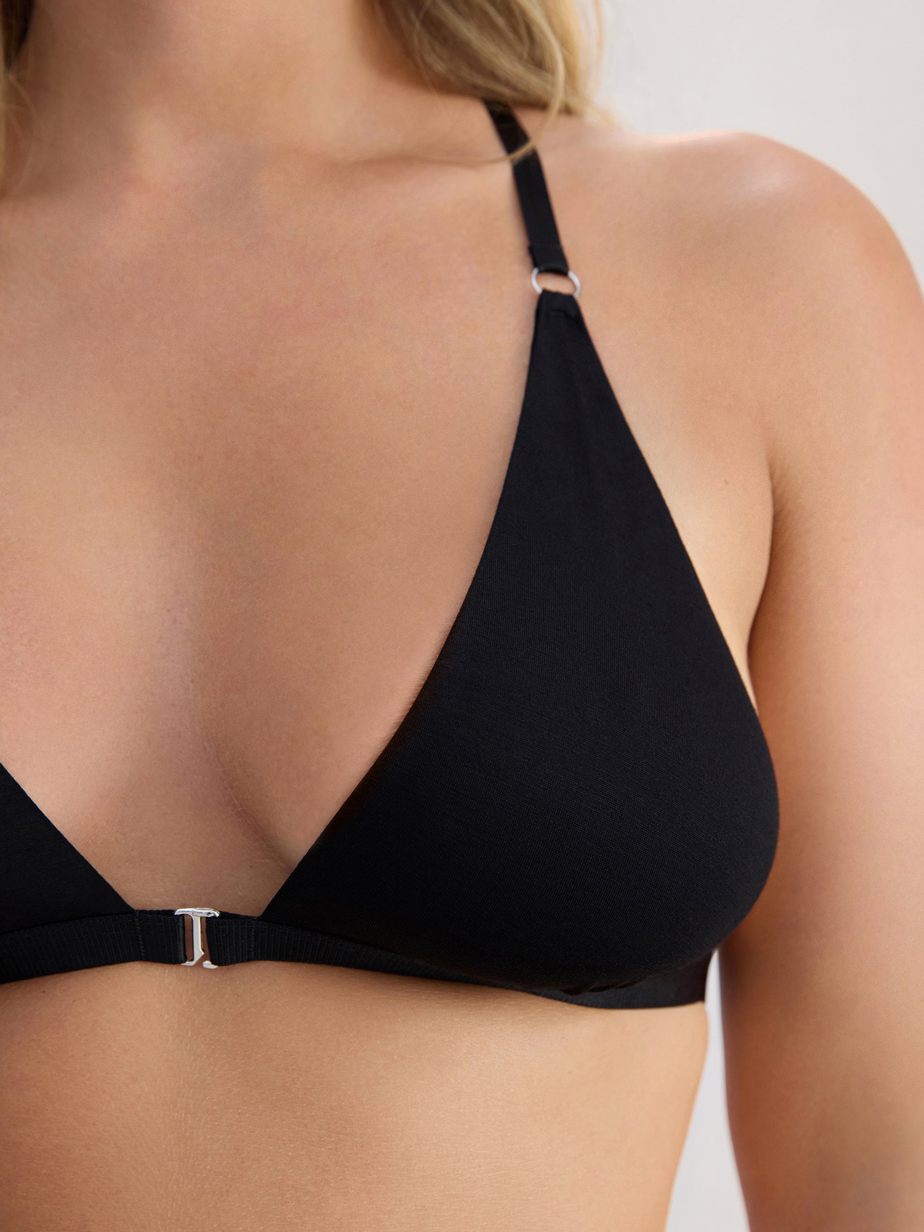 Невагомі трикутні чашки, виразний акцент на спинці та застібка на гачок попереду. Чашки ліфа складаються з двох шарів тканини, а висота та обхват під грудьми регулюються за допомогою металевої фурнітури срібного кольору.
